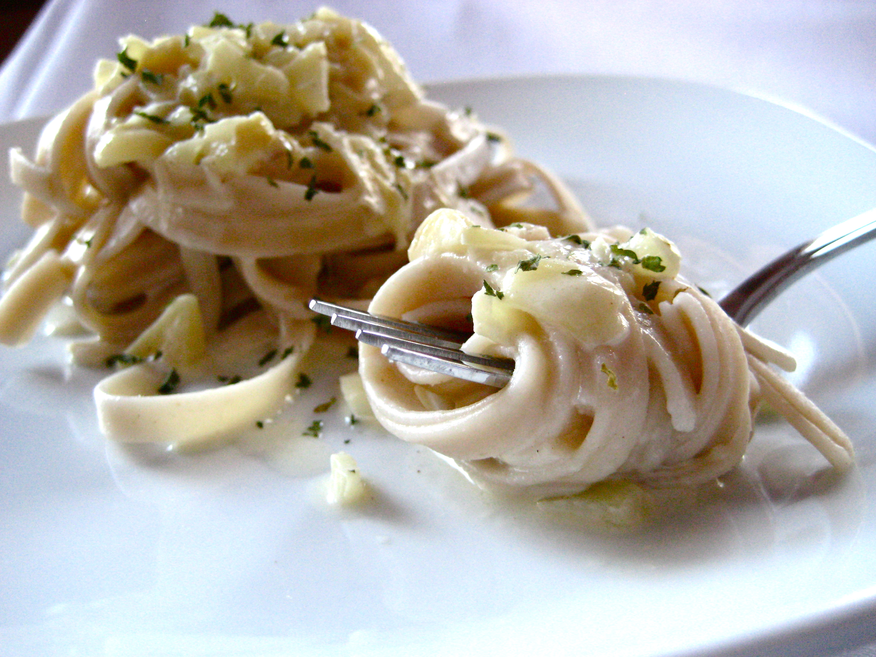In a medium skillet, heat the olive oil. Add shallot, letting cook until softened. Open the can of the coconut milk, and skim the thick cream from top, saving the thin liquid on the bottom for another use (smoothie?). Add the cream, nutritional yeast, and nutmeg to the skillet. Squeeze garlic from the bulb onto a cutting board and mash it a bit with a fork. Add it to skillet, mix well, and season with fresh ground pepper and salt to taste. Toss with the fettuccine and garnish with parsley.