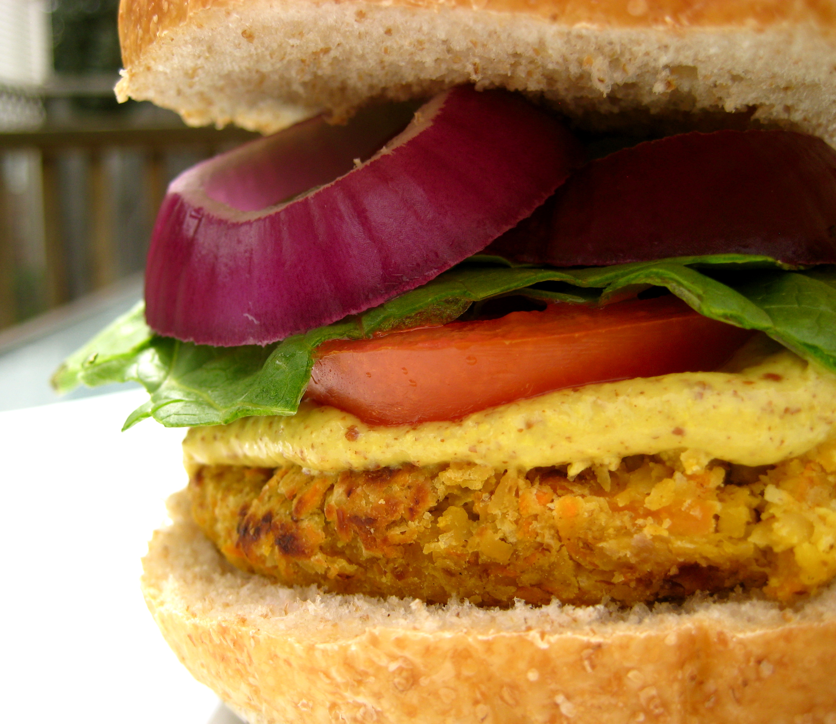 Mix together the warm water and flaxmeal. Set aside for 5 minutes, until thickened. Put the chickpeas, carrot, onion, garlic, cumin, lemon juice, tahini, flour, zest, and a pinch of salt and pepper in the food processor. Pulse until the mixture is chunky but sticks together if you press it in your hand. If you find that the mixture is getting too smooth but the ingredients aren’t well mixed, use a spoon to incorporate them. Adjust seasonings to taste. Use your hands to form the mixture into 6 patties, putting each one on the waxed paper. Refrigerate for 45 minutes.