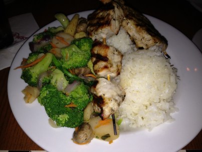 Overall, I liked my main course. I thought the veggies had decent flavor and were good well (and a little more “overcooked” which always appeals to my stomach with Crohn’s). The rice wasn’t a gummy mess like the last time I was there, so that was an improvement. I’m really liking that they are grilled the meats–they used to pan fry them. The grill really imparts some nice flavor. And of course, the shrimp were excellent, even if they were more sweet and sour like.