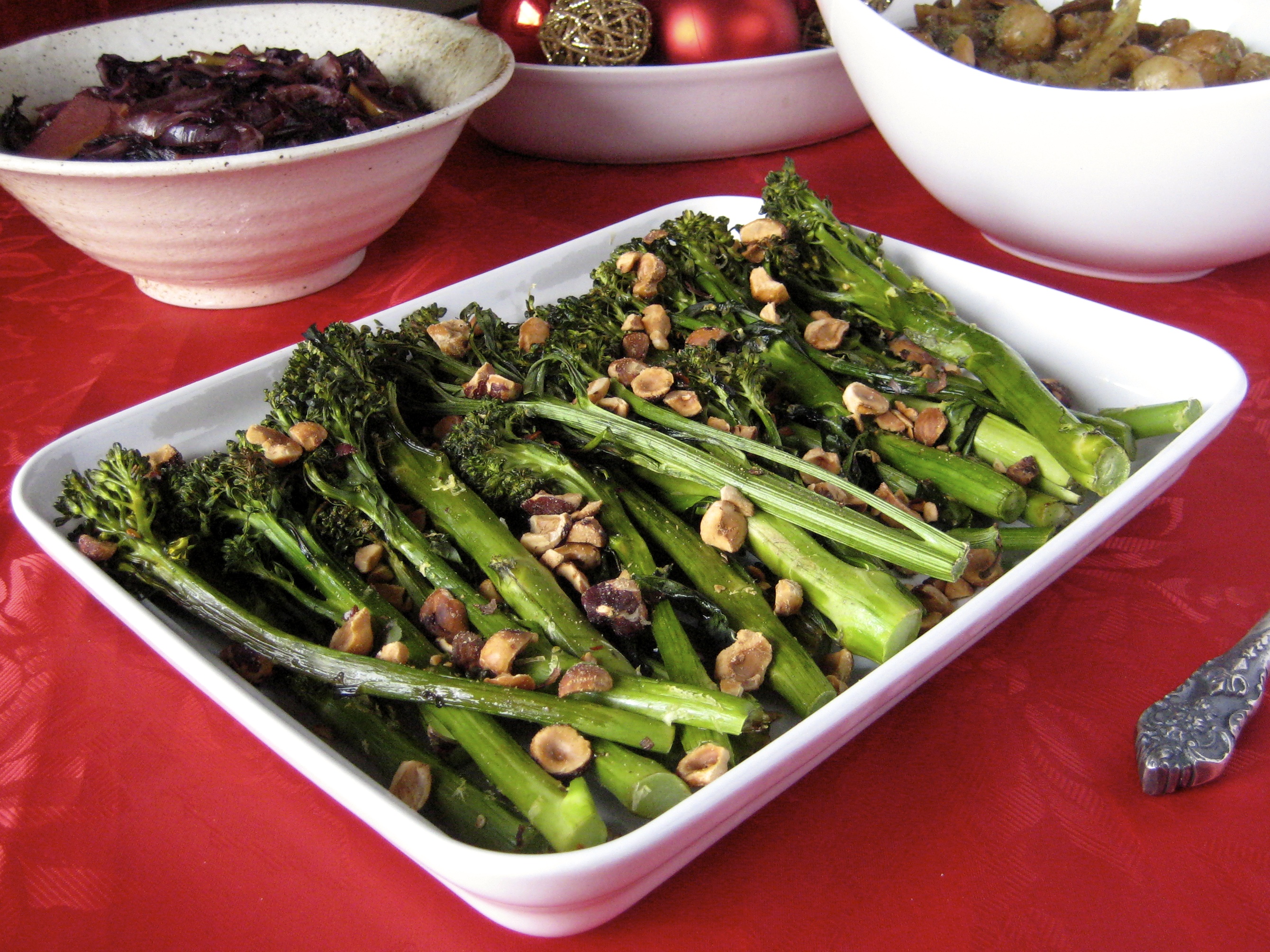 Once the vegetables are finished, lower the oven temperature to 375 degrees F. Put them in the dish. Top with the sauce mixture. Sprinkle with the nuts. Bake for 25 to 30 minutes, until bubbling. Serve warm.