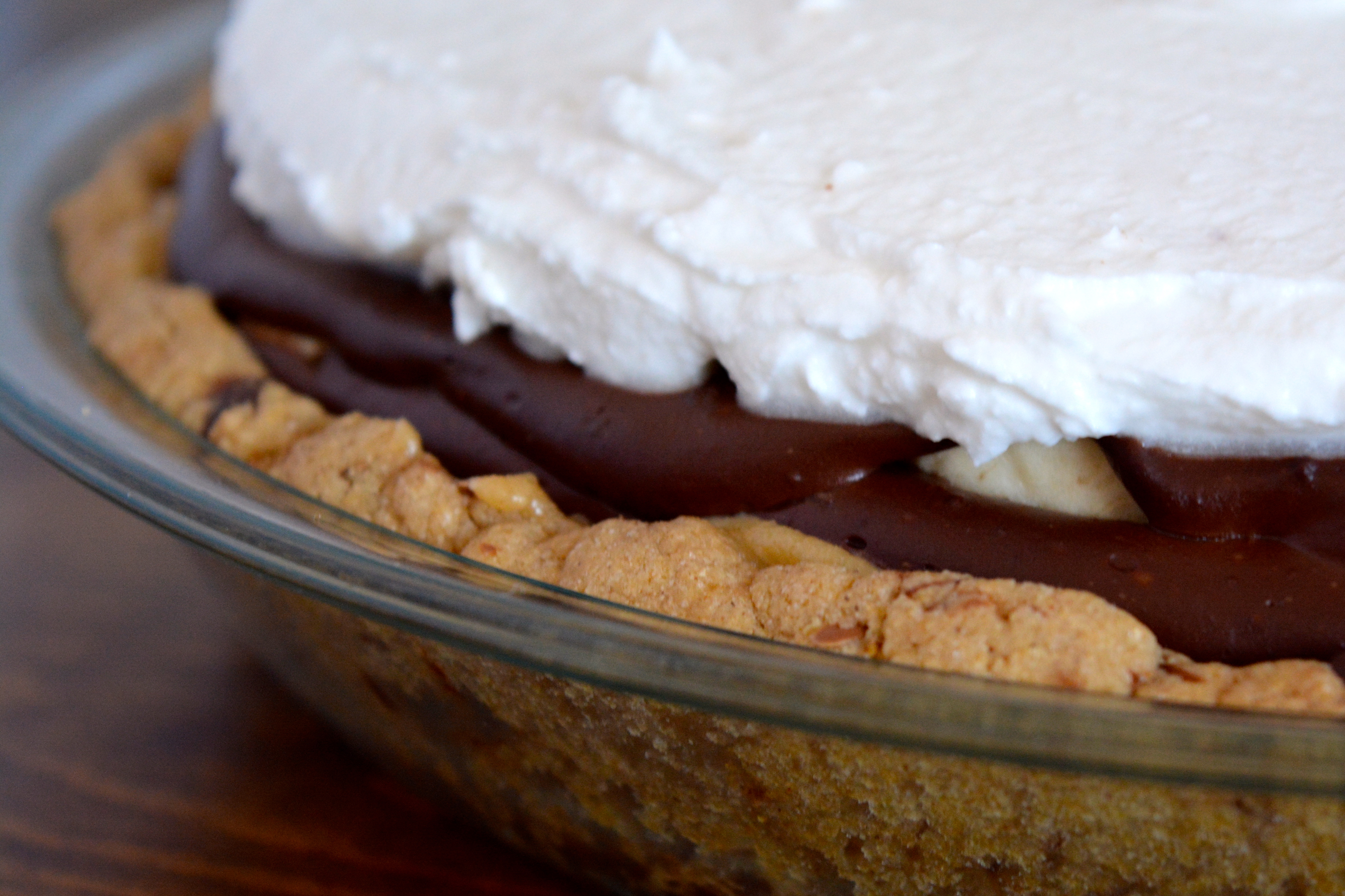 So my pie? This one is starting with a chocolate chip cookie crust, and features layers of creamy tahini-caramel, fresh bananas, rich chocolate pudding, and fluffy whipped cream. Versions of this are part of my regular pie rotation: my other favourite combination includes strawberries in place of the bananas, peanut butter (though not allergy-friendly) for the tahini, and the “graham”-style crust in my Pies and Desserts book.