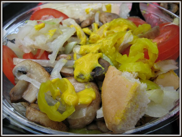She ended up giving me a salad with a bun on the side (but it was cold and dry and rock hard), lettuce, tomato, banana peppers, and two HUGE plates with sauteed onions and mushrooms. With this, I drizzled mustard on everything (yep, my favorite condiment), and ate.