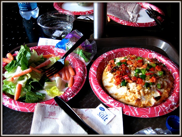 The pizzas came with a side of caesar salad, which we cannot have. He said he could put some romaine on the plate. We said okay, and asked if he had any olive oil. He didn’t. What about a lemon? Nope. So we had a side of plain romaine, but we asked for baby carrots for a dessert to make it more interesting. We assembled it and it resembled a salad. Sort of.